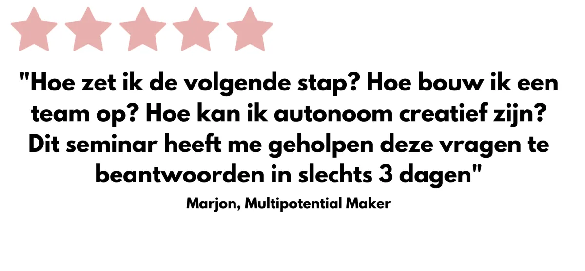 Ga met ons mee voor een 3-daagse sprong in het diepe dat door het verhelderen van je visie & het onderzoeken van praktische verbeteringen, nieuwe oplossingen zal brengen voor je uitdagingen: het Creative Business Leadership seminar. In dit seminar leer je business tools toe te passen voor creatieve doeleinden, en werk je naar je eigen Diamond Goal toe: je ideale business en toekomst.
